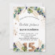 Für eine Quinceañera, 15. Geburtstagsparty. Weiß, mit Eukalyptusgrün und goldenen Blätter dekoriert. Golden Imitats Glitzer Spots. Personalisieren und fügen Sie Ihre Namen und Hochzeitsdetails. Schwarze und goldfarbene Buchstaben. Nummer 15 wird mit Schriftart im Ballonstil geschrieben. Zurück: weißer Hintergrund und goldene Imitate Glitzer Flecken