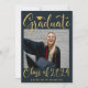 Elegantes Gold Glitzer Script auf Blue Chic Foto Abschluss Announcement Card. Glückwünsche die GRAD! Herzlichen Glückwunsch zu ihrem verdienten Erfolg und feiern sie mit dieser schönen Karte. Alle Texte sind so vorbereitet, dass Sie sie einfach und schnell mit Ihren eigenen Details personalisieren können.