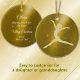 Dieses elegante Ornament besticht durch eine blassgoldene Silhouette oder einen Tänzer, der vor einem dramatischen dunkleren goldenen Hintergrund posiert. Ein Lichtstrahl beleuchtet die Figur, und überall leuchten winzige Sternlichter. Die Rückseite des Ornaments hat den gleichen goldenen und sternförmigen Hintergrund mit Ihrem benutzerdefinierten Text in Weiß. Ideal für die Tochter, Enkelin oder Nichte, die eine Tänzerin oder Balletttänzerin ist.