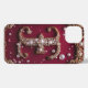 Ein verzierter Buchstabe 'F' mit goldenen Details, Perlen und Nashörnern in einem goldenen Rahmen auf rotem Hintergrund, der Luxus und Eleganz ausstrahlt.