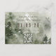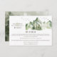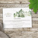 Aquarellmalerei von Bäumen, fliegenden Vögeln und Bergen im Hintergrund. Stille und ruhige Natur-Illustration mit Kiefern und Silhouetten fliegender Vögel. Vergewissern Sie sich, dass Ihr Gast alle Informationen zu Ihrem besonderen Tag mit dieser Details Gehäuse-Karte erhalten.