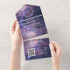Navy Blau, Galaxie, Himmelfahrt, Konstellation, minimale, schicke, elegante, rustikale, moderne gefaltete Ehe, QR-Code Hochzeit alle in einer Einladung. Das dreifache, budgetäre Set. Sie können es mit Ihren eigenen Daten personalisiert.