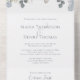 Elegante uAwg-Hochzeitseinladung mit einer leichten, staubblauen, blumengeschmückten Blume, die sich auf ein Dreifaches beschränkt, klassisch modern, mit einer schicken Antwort über das Web, modernem Klassiker, stilvollen Kalligrafieschriften, klassischem Klassikbudget, einem minimalistisch grünen Blätterblatt, einer Antwort-Web-Adresse