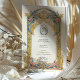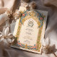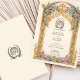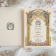 Diese luxuriöse Hochzeitseinladung wird durch die Opulenz der Rokoko-Ära inspiriert, mit einem aufwändigen vergoldeten Bogen, der mit blauen und rosa Schnörkeln geschmückt ist. Die elegante barocke Detaillierung, komplett mit goldfarbenem Filigree, wirbelnden Akanthus-Blätter und symmetrischen Verzierungen, schafft ein Gefühl zeitloser Eleganz. Ideal für Paare, die ein romantisches und künstlerisches Hochzeitsthema suchen, ist diese Einladung ideal für große Feste, Empfänge und Hochzeiten in Urlaubsort. Die zarte Typografie verstärkt die klassische Ästhetik und macht diese Schreibwaren zu einer raffinierten Wahl für ein unvergessliches Ereignis.