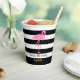 Ein rosa Flamingo erscheint auf einem gestreiften Muster. 'Happy Birthday' erscheint unter dem Flamingo in schwarzem Text. Sie können die Becher mit einem Namen am unteren Rand in Imitaten (nicht Folie) Gold Skript anpassen.