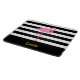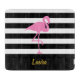 Dieses schwarz-weiße Schnittboard kann mit Ihrem eigenen Text personalisiert werden, z.B. mit Ihrem Namen in Imitaten (nicht mit Folie), am unteren Rand. Ein rosa Flamingo liegt über dem Text. Der tropische Vogel erscheint auf einem schwarz-weiß gestreiften Muster.