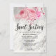 Schöne Sweet 16 Geburtstagsfeier Einladung mit Imitate silberner Marmor Glitzer Textur, Rose Gold & Silber Rose und eleganten Kalligraphie-Schriftart.