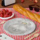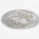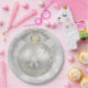Papier Teller mit einem magischen Urlaubsdesign. Mit einem silbernen Weihnachtsball mit Schneeflocken dekoriert und mit einem hübschen Silberbogen fertig. Der Hintergrund ist eine silberne Lichtillustrierung mit eleganten Sternen verstreut.
