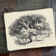 Pastorale englische Landschaft mit großem Sycamore-Baum aus Holz, antike Papierstruktur, stilvolle Karte für Vintage Illustrationsliebhaber
