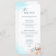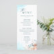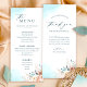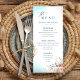Set für Ihre elegante Hochzeit am Strand mit diesem wunderschön gestalteten Beach Wedding Menu. Mit seiner sanften Aquarellpalette aus Blau, aquamarin, Türkis und Pfirsich mit zarten Blumenakzenten strahlt es sowohl boho charme als auch moderne Küstensteleganz aus. Dieses Menü ist perfekt für eine Strandfeier geeignet und verleiht Ihrem Essen eine raffinierte Touch und spiegelt gleichzeitig die ruhige Schönheit des Meeres wider.