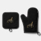 Elegantes Black-Gold-Script Monogram Oven Mitt & Pot Holder-Set