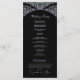 Dieses Hochzeitsprogramm ist mit einem fett-schwarzen Hintergrund gerahmt mit verzierten weißen Damast-Schnörkeln ausgestattet und verleiht ihm einen formalen und zeitlosen Stil. Oben zeigt ein dekoratives Wappen die Initialen, während im Zentrum des Designs die Namen der Ehepaare und alle Einzelheiten des Hochzeitsservices in einem gepflegten, organisierten Layout präsentiert werden. Der Kontrast von Schwarz und Weiß schafft ein auffallendes Aussehen, das Eleganz und Eleganz betont, und macht es zu einer perfekten Wahl für traditionelle Hochzeiten oder Abend.