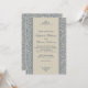 Eine wunderschön elegante Hochzeitseinladung mit einem blauen und beigen, barocken Damast-Muster überlagert mit einer abgestimmten Mischung aus beigen Streifen in zwei Tönen. Die passende blaue Textfarbe rundet das Design ab. Der gesamte Text auf dieser Einladung kann nach Ihren Wünschen bearbeitet werden.