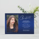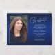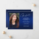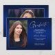 Zwei zweiseitige, moderne und elegante Abschluss-Ankündigungskarten mit modernen Textelementen und einem eigenartigen handgeschriebenen Farbskript. Das Foto besteht aus zwei eleganten -Ansichtskarten. Die Fotos des Absolventen auf der Vorder- und Rückseite der Karte sind mit einem delikaten & minimalistischen Gradientenband (das Foto hinten ist perfekt Set und bereit gerahmt zu sein). Der Hintergrund ist ein besonderes Farbverlaufsdesign, das wunderbar lebendige Blautöne von Saphir bis tiefblaue Marineblau erzeugt. Die Kartenvorderseite bietet personalisierte Textstellen für Informationen über Ihren Abschluss oder kann umformuliert werden, um diese Party Einladung zu einer Abitur zu machen. Ideal für Gymnasiasten, Unis und Studierende.