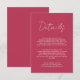Diese Hochzeitsdetails Umschließungskarte ist der perfekte Weg, um alle Ihre Hochzeitsdetails im Stil zu teilen. Das minimale Design zeichnet sich durch eine elegante Typografie auf einem lebendigen viva magenta Hintergrund aus und macht es zu einer schönen Ergänzung zu Ihrem besonderen Tag. Diese individuell gestaltbare Karte bietet alle Informationen, die Ihre Gäste benötigen, inklusive Unterkunft, Transport und Ihrer Hochzeitswebsite. Das einfache Design kann in jeder Farbe angepasst werden, sodass Sie eine personalisierte Touch für Ihren großen Tag schaffen können. Mit seiner Eleganz und Vielseitigkeit ist diese Einschließkarte für Hochzeitsdetails die perfekte Wahl für die stilvolle und moderne Braut und Bräutigam.