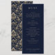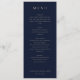 Diese elegante Hochzeitskarte zeichnet sich durch einen anspruchsvollen, tiefen Navyblauen Hintergrund mit knapper weißer Schrift aus, wodurch eine verfeinerte und formelle Atmosphäre entsteht. Das Layout ist sauber und strukturiert, mit Abschnitten für Vorspeisen, Salat, Hauptgericht und Dessert, die jeweils in einer kursiven Serifenschrift hervorgehoben sind. Anpassbare Platzhalter am unteren Ende ermöglichen eine Personalisierung, wodurch es perfekt für besondere Anlässe wie Hochzeiten ist. Das minimalistische Design betont Einfachheit und Eleganz, ideal für Paare, die einen klassischen und dennoch modernen Look für ihre Veranstaltung suchen.