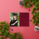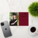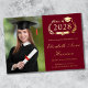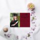 Moderne bordeauxrote Uni-Abschluss-Ankündigung mit echter Folie, "Class of" in einer Illustration von Lorbeerkranz mit einem Grade Cap Topper und Diplom, ein Foto des Absolventen und ihren Namen in einem eleganten Drehbuch. Fügen Sie ihre Schule, Hauptfach, Ehren oder künftige Pläne.