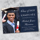 Einfache und moderne dunkelmarineblaue Ankündigung eines Uni-Abschlusses mit einem Foto des Absolventen, seinem Namen und seinem Klassenjahr in einem eleganten weißen Drehbuch und seiner Universität, Hauptfach und Ehrungen.
