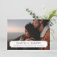 Moderne Foto-Karte Hochzeit Speichern Sie das Datum Design. Template bietet Platz für ein Foto Ihrer Verlobung mit einem einfachen klassischen Frame Overlay, in dem Sie Ihre Hochzeit und die Namen der Braut und Bräutigam hinzufügen können. Auf der Rückseite ist Platz, um bei Bedarf zusätzlichen Text hinzuzufügen. Verwenden Sie die Designtools, um Schriftart anzupassen, Text umzudrehen, Papiertypen und Hintergrundfarbe zu ändern, um Ihr eigenes einzigartiges Ankündigungsdesign zu erstellen.