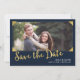 Save the Date Karte mit den Worten "Save the Date" in einem stilvollen Script-Schriftart und einem eleganten Rahmen in Imitaten Gold vor dunkelblauem Hintergrund. Die Karte enthält eine passende Rückseite. Personalisieren Sie es, indem Sie den Platzhalter-Text ersetzen und das Foto für die Auswahl/den Platzhalter durch Ihr eigenes Foto ersetzen. Für weitere Optionen, wie zum Beispiel den Schriftart zu ändern und seine Größe, klicken Sie auf die Schaltfläche "Anpassen". *Bitte beachten Sie, dass das Zazzle-Wasserzeichen, das in der Zoomvorschau angezeigt wird, NICHT auf dem gedruckten Endprodukt erscheint. © Rosewood and Citrus