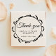 Elegantes Frame Script Vielen Dank für Ihr Hochzeit Gummi Briefmarke. Erstellen Sie Ihre eigene moderne und elegante Hochzeit dank Briefmarke. Das Design hat Dankeschön Text in elegantem Skript, Braut und Bräutigam Namen, Hochzeitstag und ein elegantes runder Rahmen. Personalisieren Sie Ihre Daten.