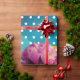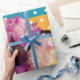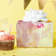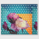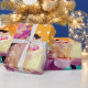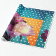 Elegantes, frisches Geschenkpapier.Schöne rosafarbene Blume Foto auf gelbem und blauem Hintergrund mit weißen Punkten für Ihre besondere Geschenkverpackung.