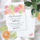 Diese lustige und moderne Zitrus-Brautparty-Einladung zeigt ein lebendiges Band aus Aquarell-Orangen-, Zitronen-, Limonen- und Grapefruitscheiben am oberen Rand, wodurch ein frisches und lebendiges Design entsteht. Darunter wird der Satz "Sie hat ihren Hauptgewinn gefunden!" in einer stilvollen Kombination aus grauer handgeschriebener Schrift und sauberen Serifenschriften dargestellt, was einen zeitgenössischen und dennoch eleganten Touch hinzufügt.