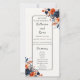 Das ist ein elegantes marineblau-orangefarbenes Hochzeitsprogramm mit blauen und orangefarbenen Blume auf hellorangefarbenem Hintergrund. Es ist ideal für einen Sommer oder Herbst und Gartenhochzeiten.