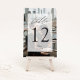 Elegante moderne Hochzeitskarten verfügen über ein vollflächiges, vertikales Foto mit einer Tischnummer, die auf einem rechteckigen, weißen Element mit schick kalligraphischem Schriftzeichen überlagert ist. Personalisieren Sie mit Ihren Initialen und Hochzeitsdatum am Ende.