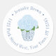Ce design d'autocollant flexible présente un pot à gingembre central rempli d'hydrangeas bleu pâle et entouré d'une bordure de texte circulaire. Montré ici pour une étiquette d'adresse de retour, mais tous les champs de texte sont flexibles selon vos besoins, par exemple, pourrait être un autocollant de remerciement.