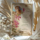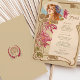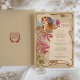 Dieses Vintag inspirierte Jugendstil-Dinner-Menü zeichnet die zeitlose Eleganz der Zeit mit seinen anmutigen Blumenbildern und seinem aufwändigen Design aus. An der Vorderseite des Menüs befindet sich eine hübsche, mit Blume geschmückte Frau, die durch fließende Linien und warme Erdtöne in Beige, Gold und Rose gerahmt ist. Die zarten lila und magentafarbenen Akzente in den Blume verleihen der Touch eine Farbe, während der weiche Vintage Hintergrund die klassische Ästhetik verstärkt. Auf der Rückseite des Hotels befindet sich ein minimalistisches Emblem, das die aufwändige Kunst der Fassade ergänzt und sich ideal für Paare eignet, die eine einzigartige, kunstvoll inspirierte Hochzeitsstätte suchen, die den Charme und die Eleganz der alten Welt ausstrahlt.