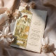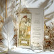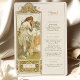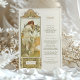 Diese elegante Hochzeitskarte zeigt ein atemberaubendes Jugendstil-Design, das von den Werken von Alphonse Mucha inspiriert wurde. Mit einer exquisiten Abbildung einer anmutigen Frau, umgeben von faszinierenden, von Blumen und Natur inspirierten Details, verbindet dieses Menü zeitlose Schönheit mit romantischer Eleganz. Die Vorderseite präsentiert das Hochzeitsmenü in edler Typografie, während die Rückseite die Mucha-inspirierte Kunst mit einem stilvollen Blumenmotiv und personalisierten Hochzeitsdetails fortführt. Ideal für Paare, die eine Vintage, aber raffinierte Ästhetik suchen, fügt diese Karte Ihrer Hochzeitsfeier eine künstlerische Touch hinzu.