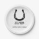 Elegantes klassisches Schwarz-weißes Pferderennen Derby Party Papier Teller Horseshoe Illustration kann so verändert werden, dass dieses Design auch für andere Pferderennen verwendet werden kann. Verwenden Sie das Entwurfstool, um die Bild- und Textelemente zu skalieren oder den Schriftart zu ändern.