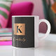 Stilvolle moderne, luxuriöse Monogramm-Initial-und Signatur-Skript-Name personalisierte Kaffee-Tasse mit einem Imitat metallischen goldenen Kupfer-Quadrat mit Anfangsbuchstaben und Ihrem Namen über einem schwarzen Leder wie (PRINTED TEXTURE) Hintergrund.
