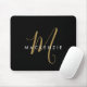 Eleganter Modern Black Gold Script Monogram Mouse Pad. Ein elegantes Goldskriptmonogramm in Verbindung mit einem weißen San-Serif-Schriftart sorgt für ein zeitgemäßes Aussehen.