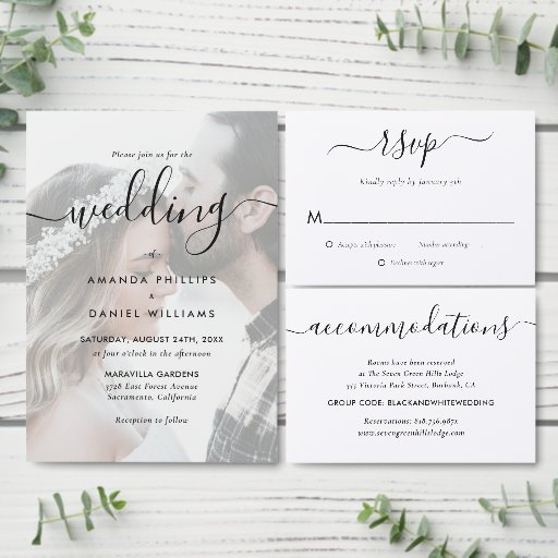 Elegantes, modernes Skript Schwarz und Weiß Hochze Einladung