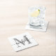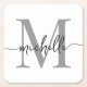 Girly Elegant Modern White and Gray Monogram Initial Name Signature Script Custom Personalisiert Square Paper Untersetzer. Dieses Design mit Ihrem Vornamen in einem hübschen handgeschriebenen Stil Swash Schwanz Schriftart Typografie (oder Kalligrafie) mit Monogramm initial in Schwarz und Grau auf Weiß. Einfach zu anpassen. Große stilvolle feminine Hauswärmeschenke, auch zum Geburtstag, Muttertag, Hochzeit, Brautparty, süße 16 Geburtstagsparty, Babydusche, für Graduiertenfeier und Es ist für das Mädchen, das einzigartige minimalistische Dinge Lieben.