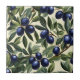 Ein wunderschön illustriertes Muster tiefblauer Oliven auf üppig grünen Zweigen Set vor einem hellen Hintergrund. Die lebhaften Farben und die realistischen Details machen dieses Design perfekt für Textilien, Tapeten und Dekoration.