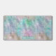 Diese attraktive Schreibtischmatte besticht durch einen eleganten pastellblauen, rosa und aquamarinen abstrakten Hintergrund. Ihr Name oder Monogramm ist im dunklen aquamarinen Mitte des aquamarinen Banners am unteren Rand.