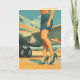 Eine stilvolle Pilotin in marineblauer Uniform und hohen Absätzen steht neben einem Vintagen Flugzeug voller Eleganz und Reiz.