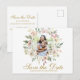 Ein eleganter Zirkel von Aquarellbäumen, rosa Torfbäume und Elfenbeincreme-Rose umrahmen dieses schöne sommerliche Save the Date Foto Postkarte. Die botanischen Blätter der Salbei-grünen Eukalyptusbäume schmücken inmitten der pfirsichfarbenen Reihe von Blume über dem schönen antiken Goldskript. Der Schwarz fügt dieser Karte eine romantische Touch hinzu. Diese delikaten Einladungen sind ideal für eine schöne Gartenzeremonie mit einem Empfang im Freien. Fügen Sie Ihre eigene Verlobung Foto.