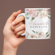 Elegantes Rosa und elfenbeinfarbene Blume aus Aquarell umrahmen die Ober- und Unterkante dieser herrlichen Frühjahrsheirat-Tasse für Ihre Blume. Inmitten der Pfirsichblütenbäume, die den personalisierten Namen Ihres Brautparty in der Kalligraphie umgeben, schmücken die grünen Salbei-Blätter.