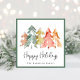 Elegante quadratische Weihnachtskarte mit wunderschöner Aquarellfarbe abstrakt von Kiefern in gedämpften Schattierungen von Salbei, Rot, Gold und verbrannter Orange und "Happy Holidays" in einem stilvollen Drehbuch. Auf der Rückseite fügen Sie Ihr Foto, einen personalisierten saisonalen Gruß und Ihre Namen in einem signaturähnlichen weißen Skript auf einem sage-grünen Hintergrund.