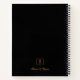 Elegantes, monogramm personalisiertes Wendelheft aus Gold. Vordere Mitte - kleines formales Goldtext-Monogramm innerhalb eines quadratischen Randes, schwarzer Hintergrund. Untere Seite - kleines formales Goldtext-Monogramm innerhalb eines quadratischen Randes und Text-Name des Skripts darunter, schwarzer Hintergrund.