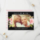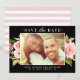 Stilvolle Hochzeit speichern Sie das Datum Ankündigung Karte Design verfügt über ein horizontales Foto Verlobung gerahmt durch eine hübsche Aquarellblütenanordnung mit grünem Blattwerk und Pastellrosa, Rosa, Pfirsichfrüchte und Sommer Dahlia und Rose Blume. Ein Muster aus weißen, horizontalen Streifen zieht die Rückseite der Karte nach oben. Die Farben Schwarz und Ballet Rosa können auf Ihre Hochzeitsfarbe abgestimmt werden.