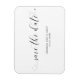 Eine Typografie Save the Date Magnet mit schwarzer Kalligrafie mit Wimpern und Herzen über einem weißen Hintergrund. Die schlichte und minimalistische Anordnung und die viel offene Fläche verleihen diesem Design ein modernes Ambiente und die kalligraphische Schrift und das Herz geben ihm eine romantische Drehung.