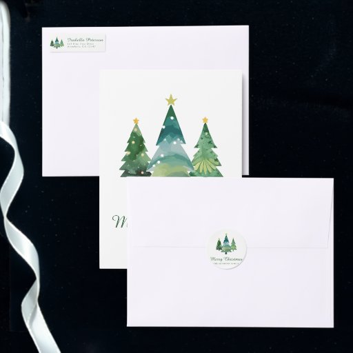 Dieses elegante Weihnachtsfest kann kühler mit drei sanft bemalten Aquarellbäumen, die jeweils ein Gefühl von Ruhe und saisonalen Charme hervorrufen. Die Vorderseite ist mit "Frohe Weihnachten" in anmutigen Drehbüchern geschmückt und fügt dem Design eine Touch von Eleganz hinzu.