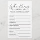 Spüren Sie Ihr modernes Schwarz-Weiß-Brautparty mit dem eleganten Script Who Knows The Bride Best Game! Dieses ausgeklügelte Brautparty-Spiel bietet einen minimalistischen Script-Schriftart für einen sauberen, zeitlosen Look. Lachen Sie und verbinden Sie Ihre Lieblings-Braut-Erinnerungen, während Sie versuchen zu beweisen, dass Sie ihr Bestes wissen. Mit nachdenklichen Fragen, die ein Gespräch auslösen, sorgt dieses Spiel für ein herzliches Fest. Das elegante Script Game ist perfekt für ein stilvolles, intimes Brautparty mit nahen Freunden geeignet und bietet eine Touch von Auszeichnung. Es ist eine denkwürdige Art, die Braut zu ehren, während man seine Gäste zusammenbringt. Machen Sie Ihr Brautparty ein, um sich mit diesem einzigartigen Spiel zu erinnern!