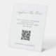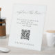 Ein einfaches, elegantes Script erfasst die Liebe QR Code Wedding Pedestal Sign in Schwarz und Weiß.