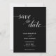 Save the Date in einem eleganten Schriftart und Ihre Details unten, wir zeigen auf einem schwarzen Hintergrund, aber Sie können zu jeder Farbe ändern! FOTOS und/oder mehr Details auf der Rückseite hinzufügen. Schriftart können geändert werden, klicken Sie einfach auf den CUSTOMIZE-Link weiter.